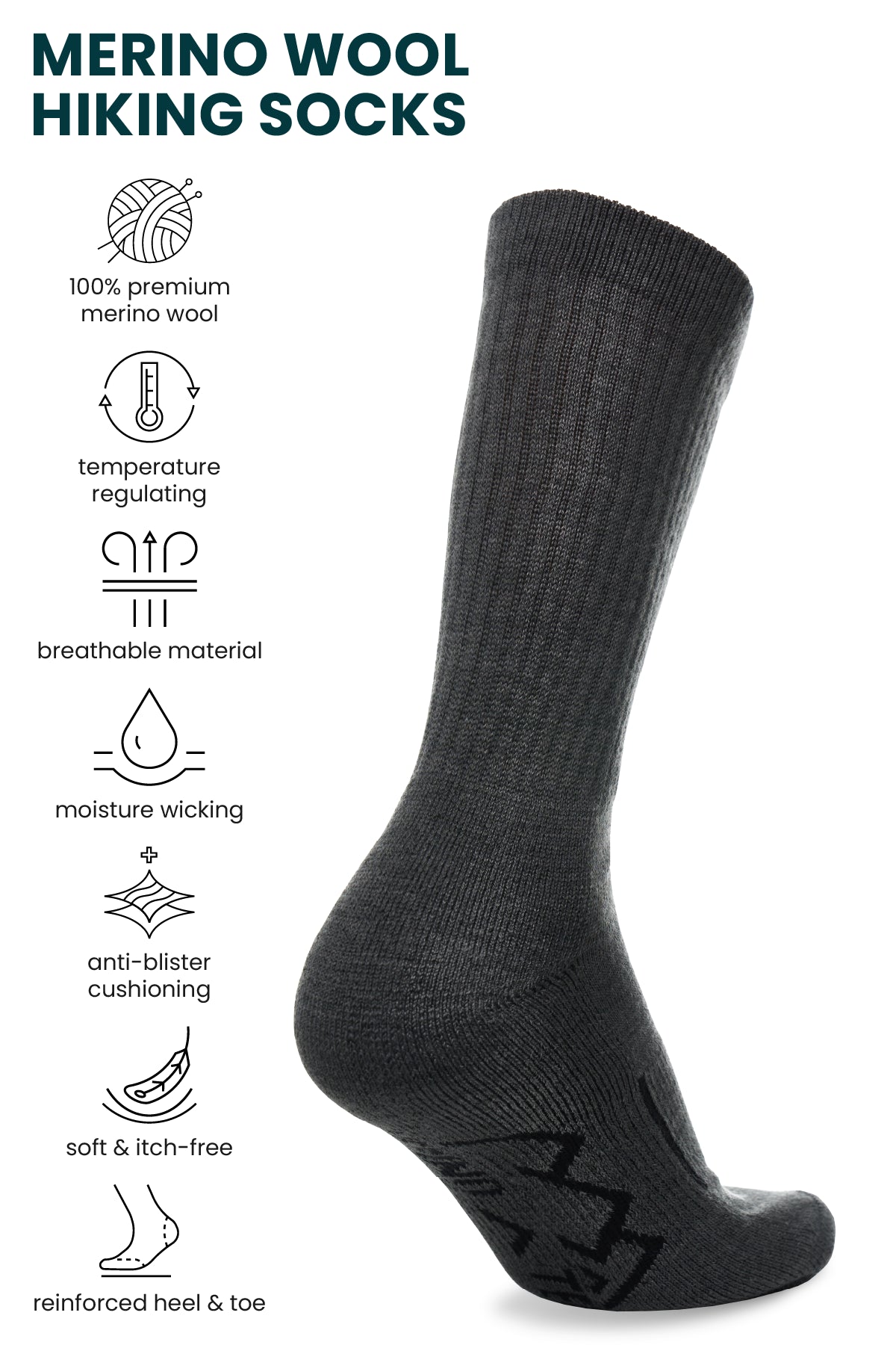 These Merino Wool Hiking Socks are built for durability and comfort in challenging environments. The natural thermoregulation of Merino wool adapts to changing temperatures, while breathability allows heat to escape efficiently. Moisture-wicking fibers keep feet dry, minimizing friction and discomfort. Odor resistance ensures freshness throughout long hikes. The soft, hypoallergenic fabric prevents irritation and enhances comfort.