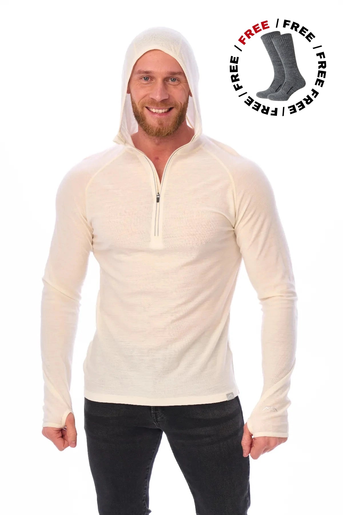 Men's Merino Wool Half Zip Hoodie 190 Off White